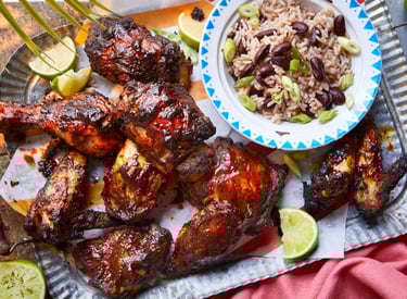 Goûtez notre jerk chicken mariné, grillé à la perfection pour une expérience culinaire unique.